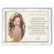 Eleganckie podziękowanie dla Chrzestnych i Dziadków w białej ramce, dekorowane motywem komunijnym to wspaniały pomysł, by okazać wdzięczność najbliższym na przyjęciu komunijnym. Do wyboru mamy różne teksty: dla Babci, Dziadka, Chrzestnej lub Chrzestnego. Całość prezentuje się bardzo subtelnie, a zarazem efektownie.