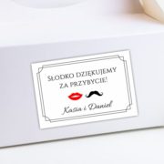 W cenie: indywidualny projekt graficzny naklejki z podziękowaniami, pudełko na ciasto z wkładką usztywniającą dno, karteczka z podziękowaniem w formie naklejki