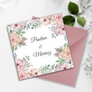 Zaproszenie na ślub z delikatnymi różowymi kwiatami oraz geometrycznym wzorem. Na okładce wyróżnione są imiona młodej pary oraz data uroczystości. Dodatkowo do zaproszenia można dołączyć dekoracyjny sznurek. Zaproszenie drukujemy na papierze gładkim satynowym bądź na fakturowanym.